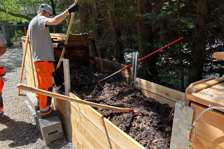 Afin d’assurer un processus de compostage équilibré et une bonne qualité de compost à la sortie, les déchets alimentaires sont mélangés à du broyat. Avec ce mélange, on remplit progressivement le premier bac à compost. Une fois plein, on transfère la matière dans le bac suivant. Cette opération permet d’oxygéner le compost ce qui favorise une dégradation rapide des matières organiques. De cette manière, après 3 à 6 mois, on obtient comme résultat un compost mûr.
